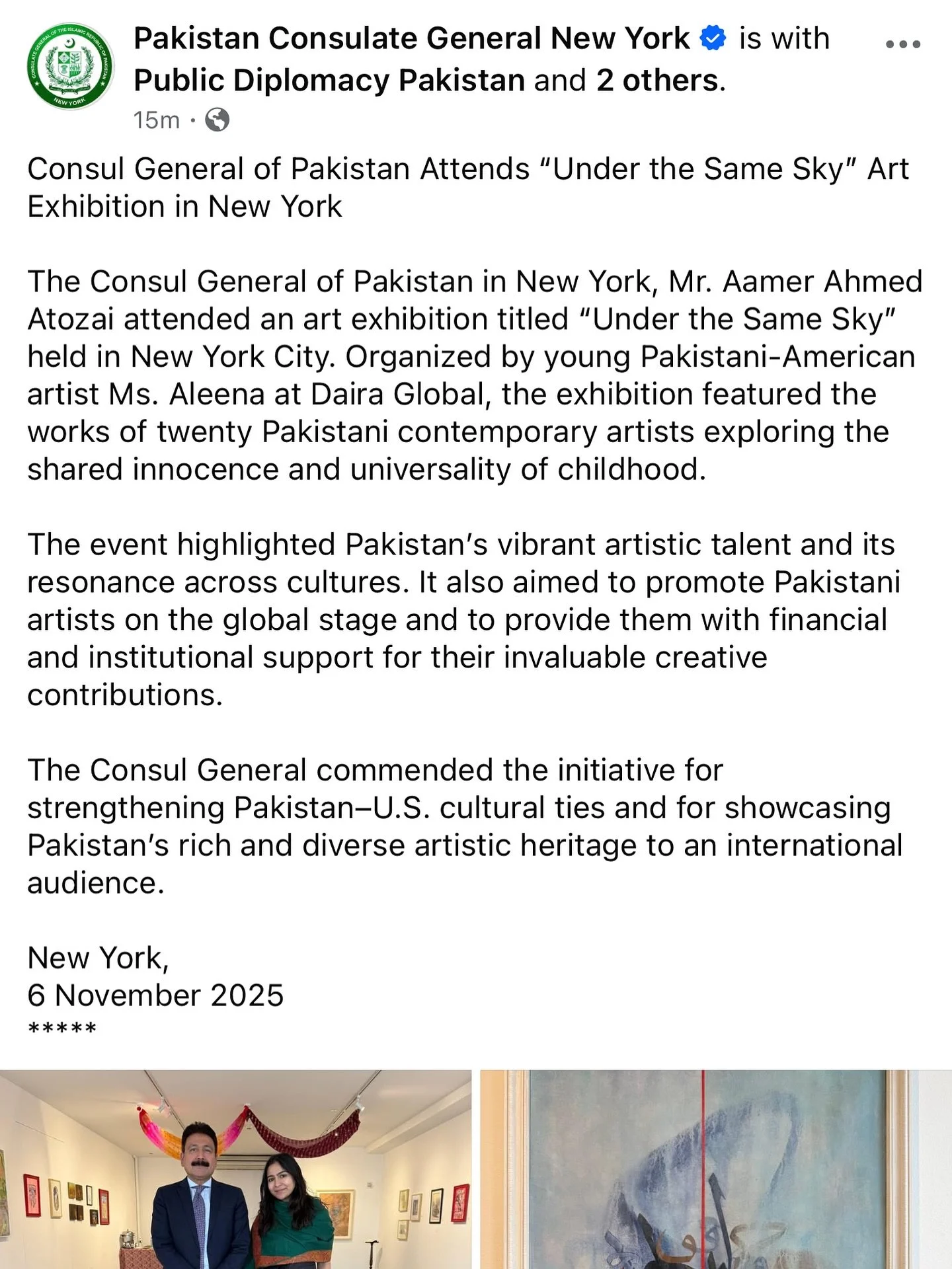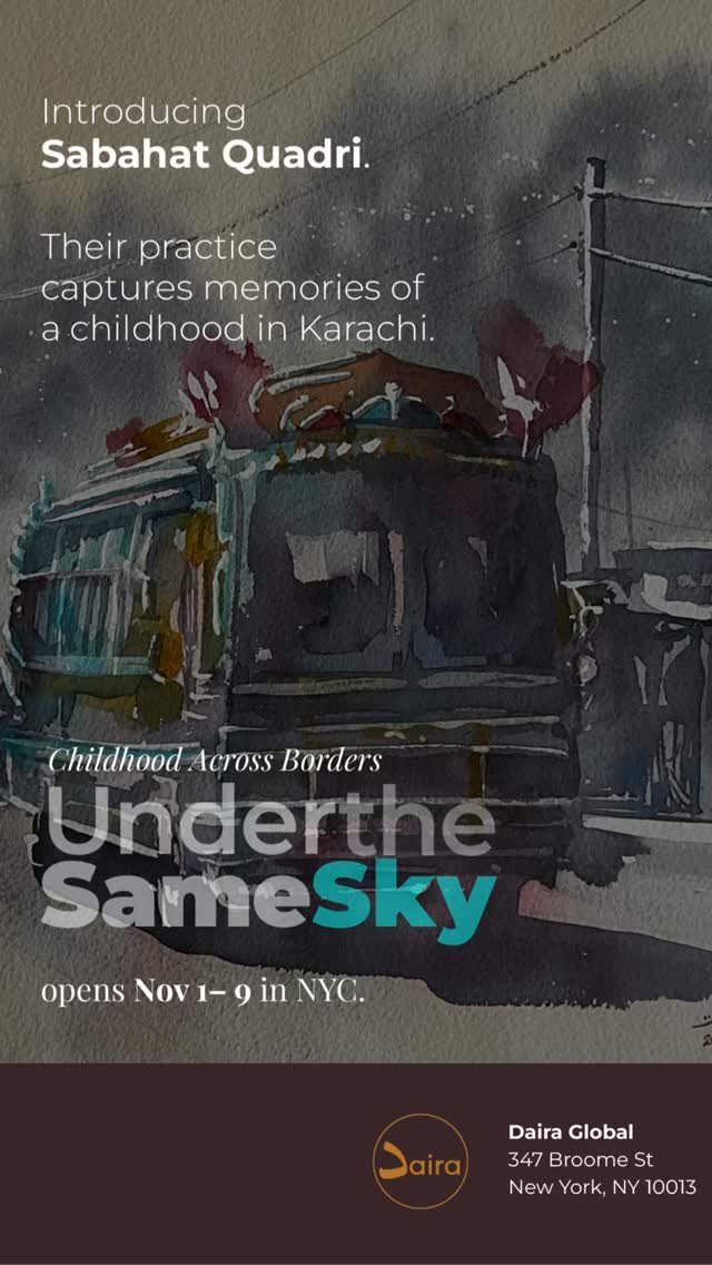 This November, Daira Global is proud to present Under the Same Sky, a group exhibition bringing together over twenty contemporary Pakistani artists in New York City. Spanning distinct styles and techniques, the exhibition revisits childhood through symbols, characters, and places that are deeply personal to each artist yet resonate across borders.
