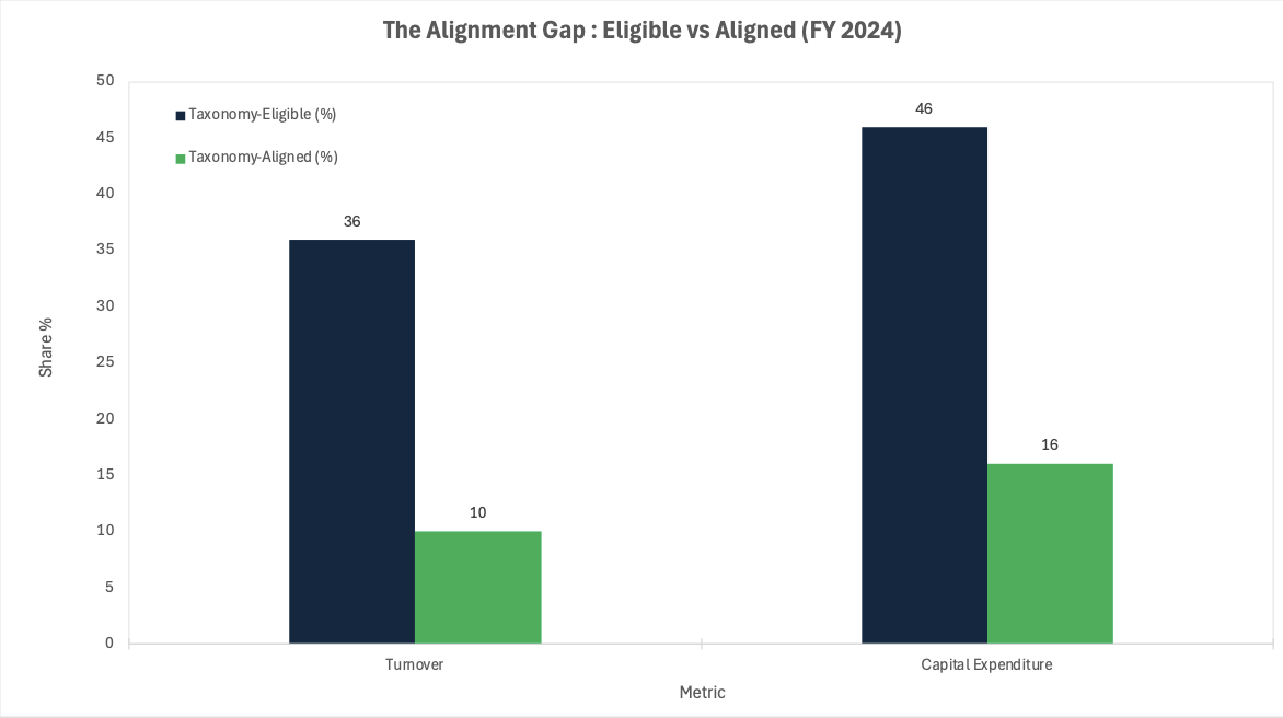 Chart 1 — The Alignment Gap: EU Taxonomy Eligibility vs True Alignment (FY 2024)