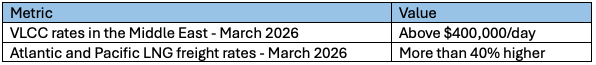 The most useful live indicator is not yesterday’s bunker demand but today’s freight repricing. Reuters reported in March 2026 that VLCC rates in the Middle East rose above $400,000 a day and Atlantic and Pacific LNG freight rates jumped more than 40 per cent as shipowners reassessed Gulf exposure. That is exactly what an operating-cost shock looks like: transport capacity becomes scarcer and more expensive before the macro narrative is fully visible in benchmark oil prices.”