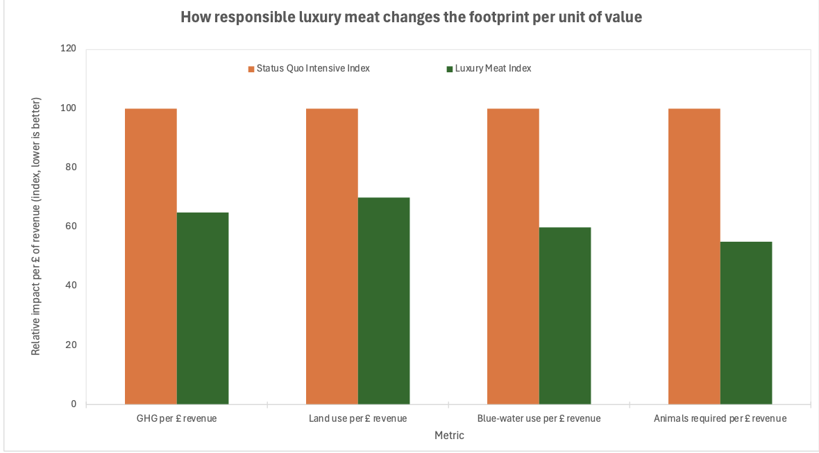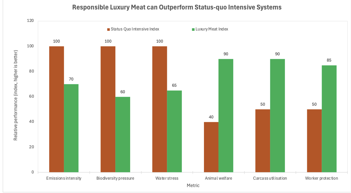 Better feed, land management, water practices, welfare, carcass utilisation and labour standards mean well‑designed luxury meat systems can materially reduce key impacts relative to intensive models.